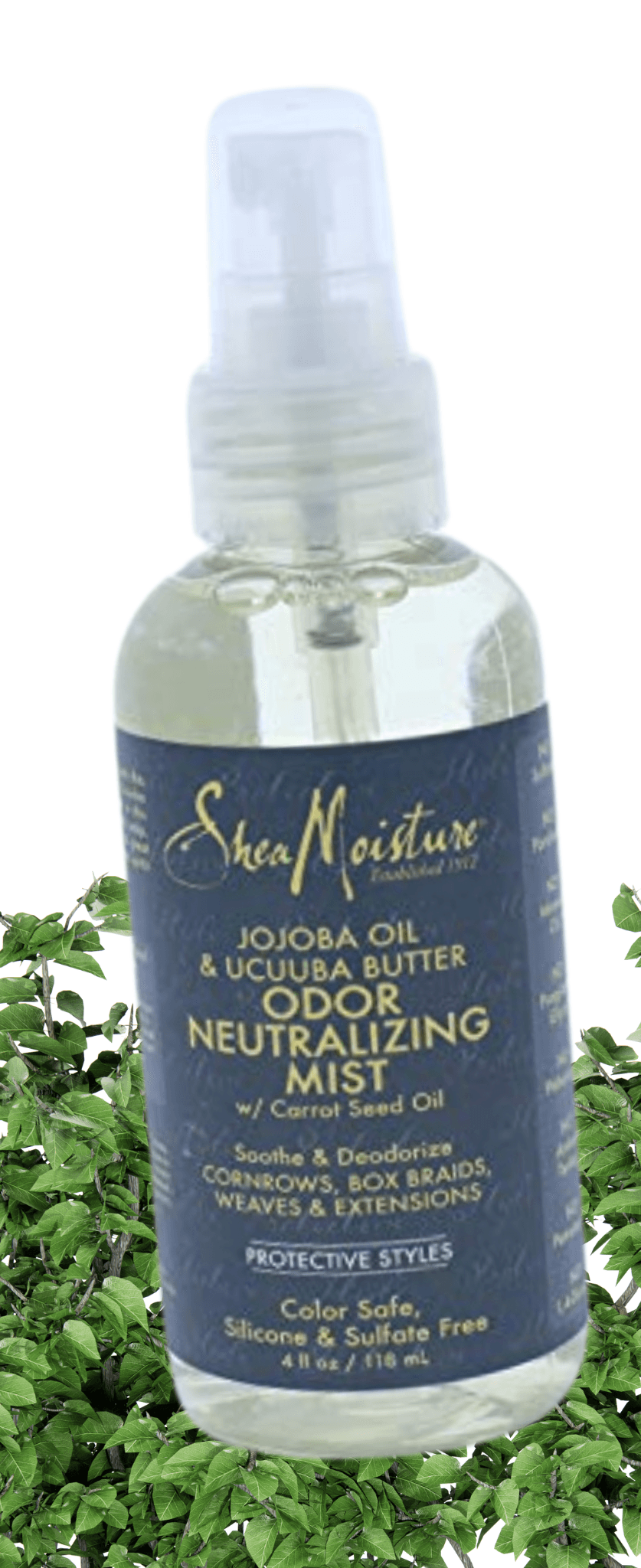 Shea Moisture jojoba oil & Ucuuba butter odor neutralizing mist, made with natural and certified organic ingredients. Soothes & deodorizes. For cornrows, box braids, weaves & Extensions. Silicone & sulfate free. Color safe.